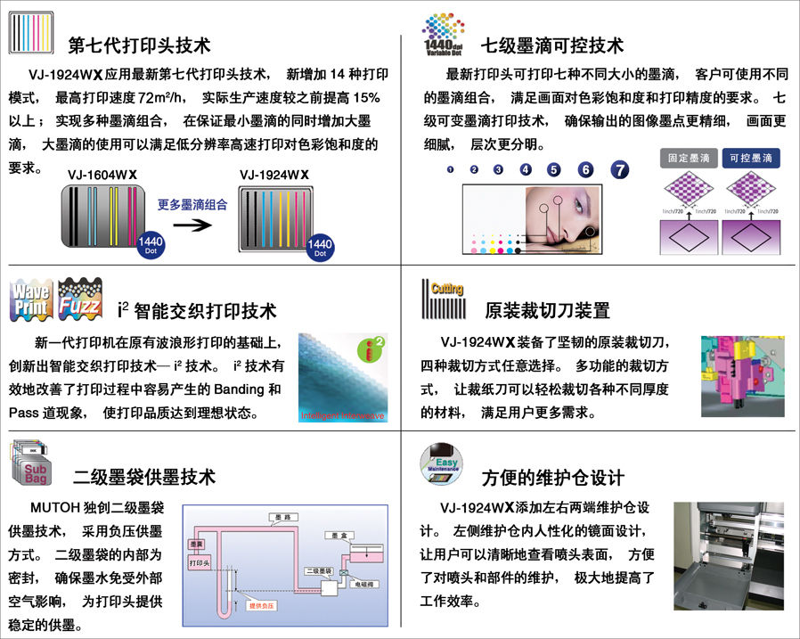 ? 一組第七代打印頭,四色(CMYK)打印機;? 最大打印幅寬1,900mm,最高打印速度72平米/小時;? 七級墨滴可控技術,I2智能交織打印技術;? 支持介質自動裁切,打印頭高度三檔可調;? 獨創二級墨袋技術,左右兩側維護倉設計。