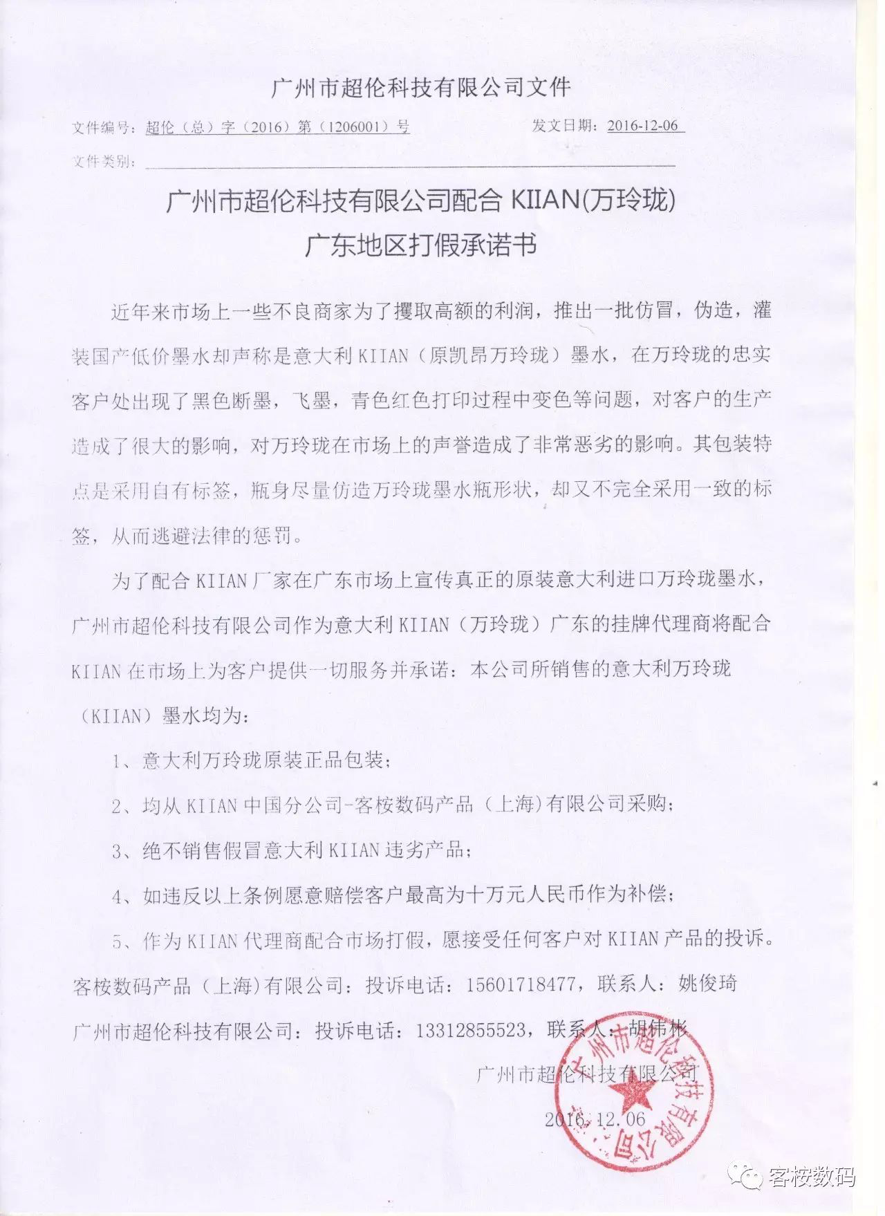 我們嘗試尋找合規合法的經銷商,如下文件所示,廣州超倫科技有限公司主動配合我公司在廣東地區打擊假冒KIIAN墨水的行動,做出十萬元人民幣的保證承諾,我們要求所有的經銷商和我們一起真正以客戶的利益放在第一位。