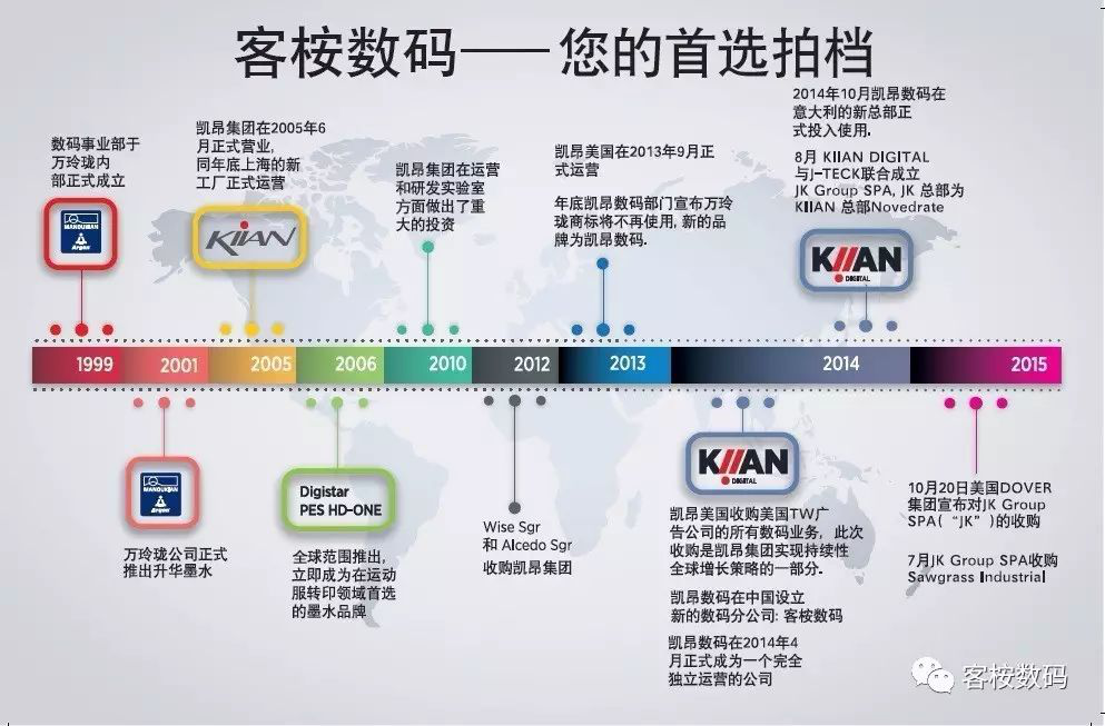 如第二圖所示,意大利KIIAN數碼(正式翻譯為凱昂數碼)前身為意大利凱昂萬玲瓏[英文為KIIAN MANOUKIAN(R)],后由于公司之間的收購并購,放棄了MANOUKIAN(R)商標,在合并了J-Teck之后更名為J&K Group。而客桉數碼產品(上海)有限公司成立于2014年,是J&K Group在亞洲的唯一子公司。